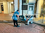 | ■警员用白布遮蔽遗体。(8旬老翁堕楼身亡 警登门调查揭妻倒毙寓所) |